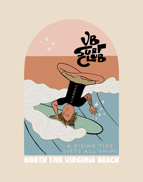 A dreamy nod to the rhythm of Virginia Beach, VB Surf Club is Mara Aphrodite’s whimsical tribute to local surf culture—where board meetings happen on waves, not Zoom. Inspired by real characters, sun-faded afternoons, and the quiet magic of the oceanfront, each piece blends beachy nostalgia with flowing lines and playful storytelling. The prints feel like memories you almost forgot—washed in salt, sand, and just a touch of stardust. From soulful surfers to coastal landscapes seen through a surreal lens, this collection captures the spirit of VB in motion—laid-back, sunlit, and full of feeling.
